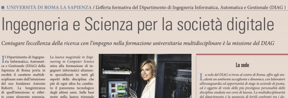 Sullla Guida alle università della rivista Scenari, le aziende informano del 10 giugno 2019 a cura del Sole 24 Ore è stata pubblicata l'offerta formativa del DIAG.